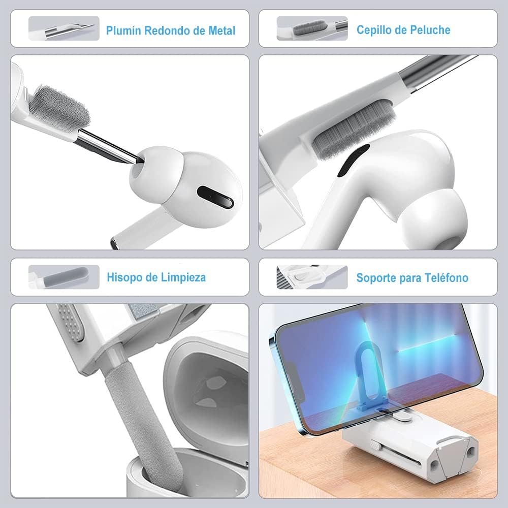 Kit de limpieza multifuncional: este kit de limpieza electrónico 8 en 1 incluye 1 cepillo grande de alta densidad, 1 esponja suave pequeña, 1 bolígrafo de limpieza para airpods (incluye punta de metal y mini cepillo de alta densidad), 1 extractor de teclas, 1 soporte para teléfono celular, 1 paño de fibra extraíble, 1 paño de limpieza de franela y 1 botella de spray (0.1 fl oz de líquido de limpieza) para cada necesidad de limpieza.